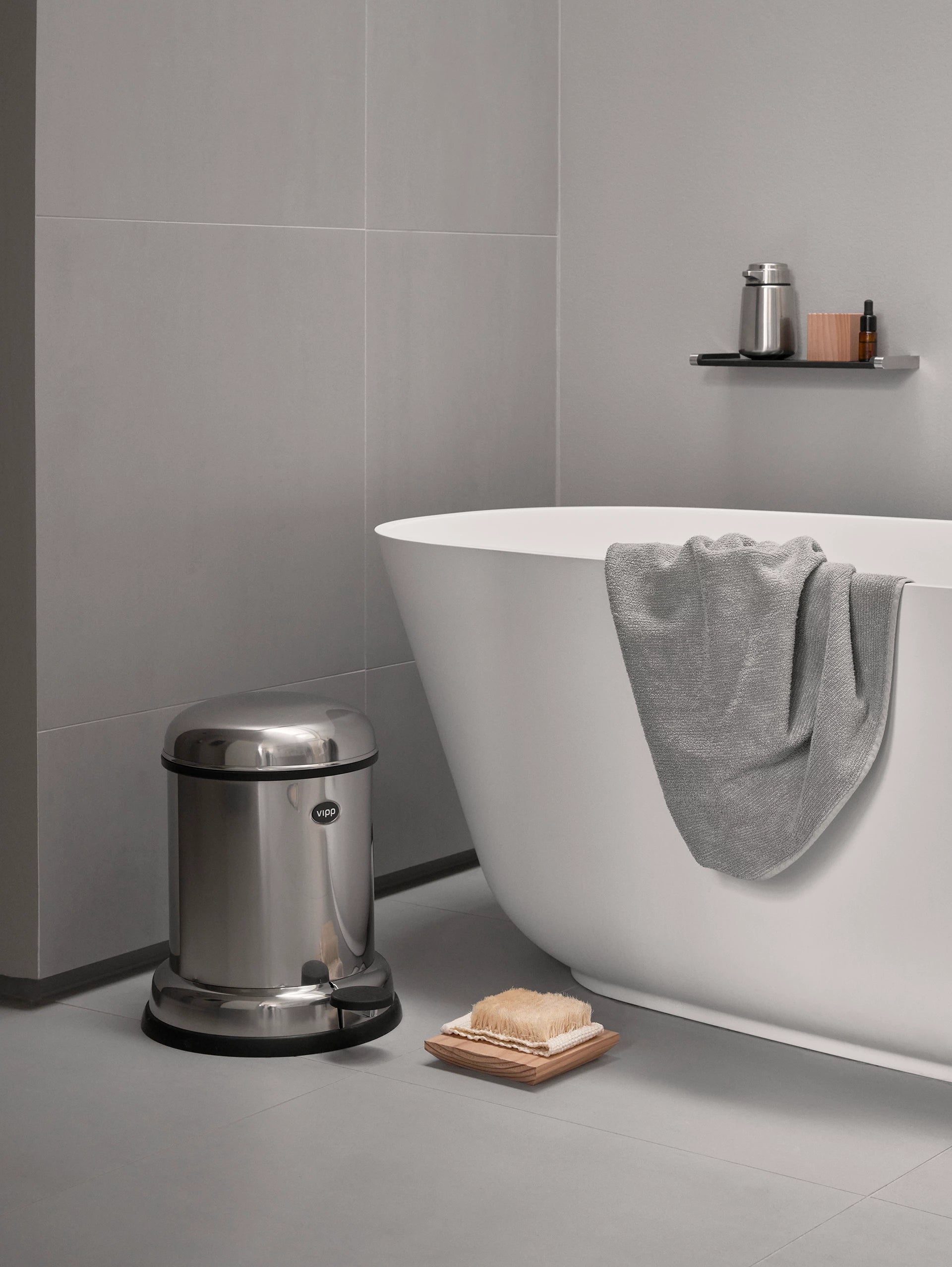 The Vipp 13 pedal bin is a 4-litre waste bin, ideal for bathrooms and small spaces. It is equipped with a damper mechanism for smooth closing of the lid, along with a rubber ring that ensures an airtight seal. The body is manufactured from either powder-coated steel or stainless steel, concealing a removable inner bin made of galvanised steel. Additionally, a rubber ring at the base ensures that sensitive surfaces are safeguarded.