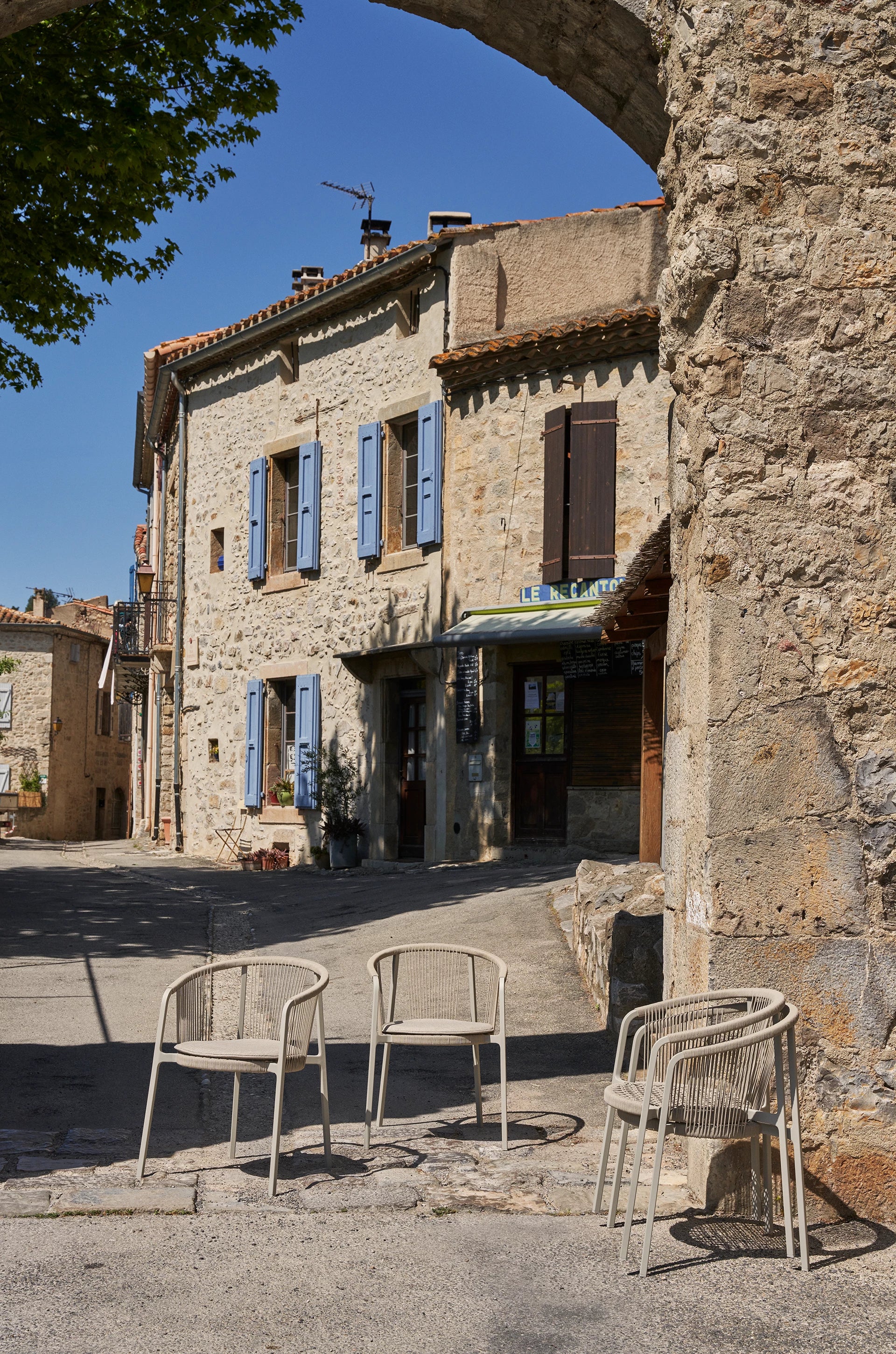 The stackable Lagrasse chair comprises a simple powder-coated aluminium frame with a round backrest that extends to form the armrests. The chair is completed with a comfortable cushion upholstered in a woven outdoor textile.
