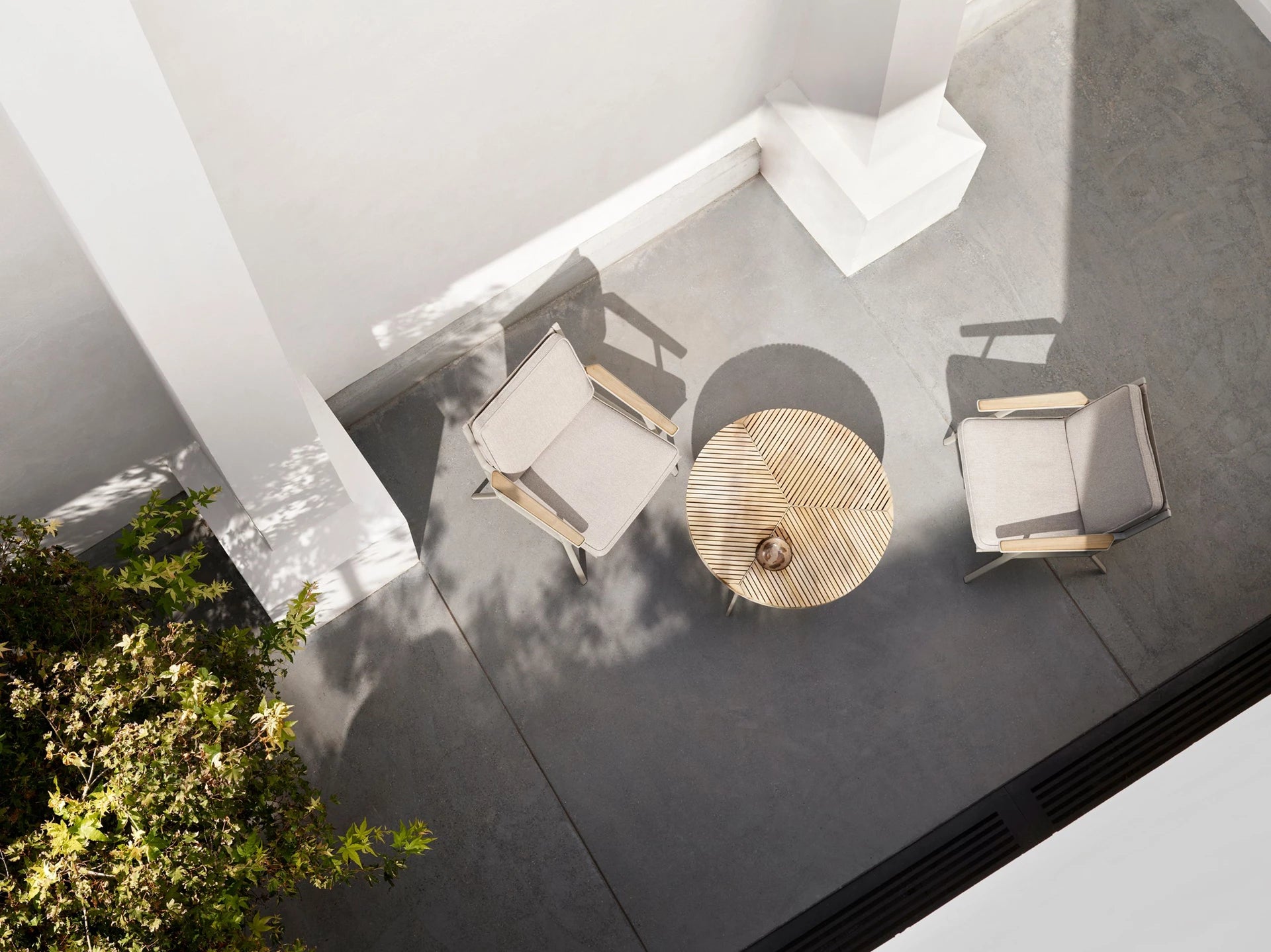The upholstery specially made for outdoor use is woven in Italy’s Lombardy region. A vibrant two-tone effect characterises the textured surface and grants the collection a tactile sophistication.