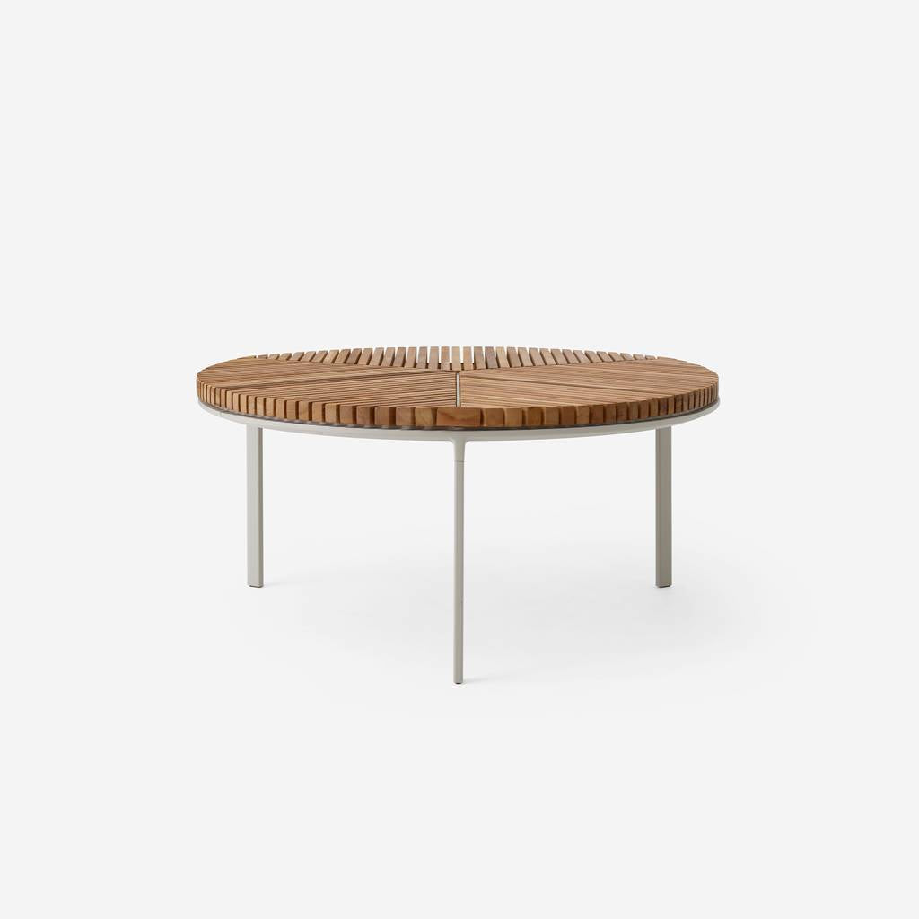 The Open-Air outdoor coffee table is modelled after the indoors Vipp425 Coffee table. Consisting of a three-legged aluminum frame with a Ø90 tabletop consisting of teak lamellas, the coffee table offers a durable and elegant look for the lounge area. It can be combined with the Open-Air Ø60 coffee table.