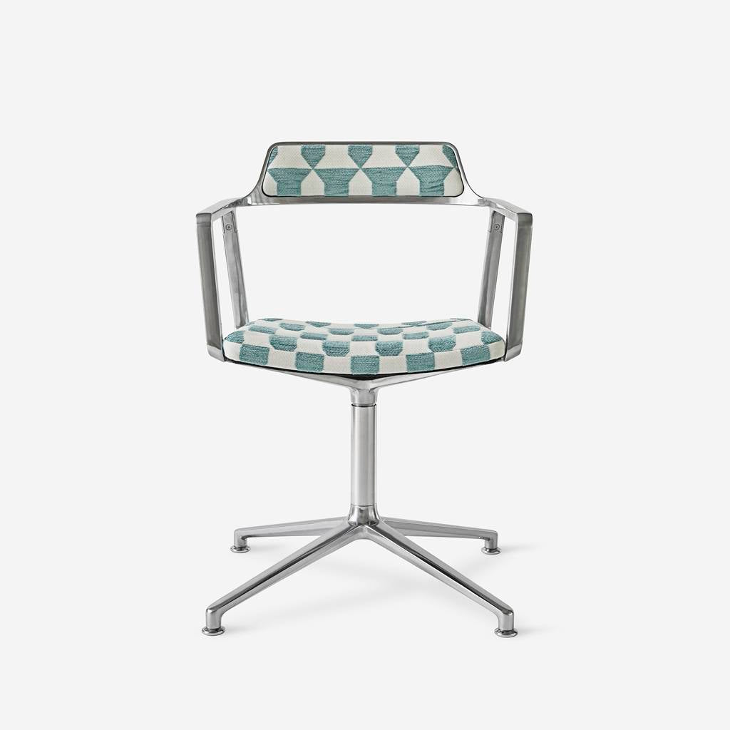 Estofada num tecido ousado com um estampado bicolor, inspirado num brasão medieval, esta cadeira giratória Vipp, de edição especial, foi criada para a Vipp Townhouse, em Lagrasse. O motivo histórico, originalmente desenhado pela conceituada casa têxtil francesa Maison Le Manach, foi reinterpretado pelos ateliers de Pierre Frey, no norte de França.